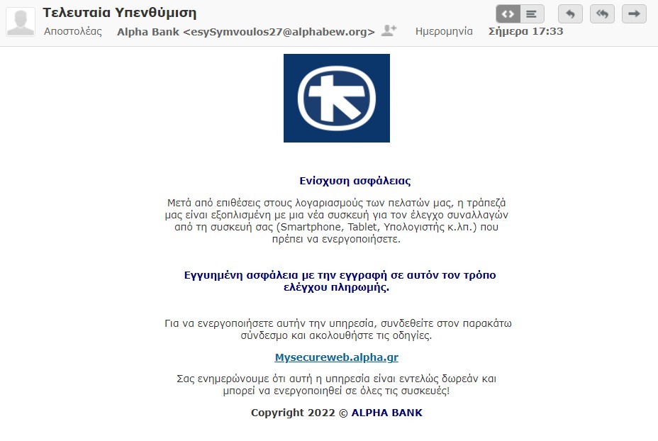 Σε περίπτωση που λάβετε αυτό το μήνυμα, διαγράψτε το χωρίς να πατήσετε στα link που θα δείτε να αναγράφονται.