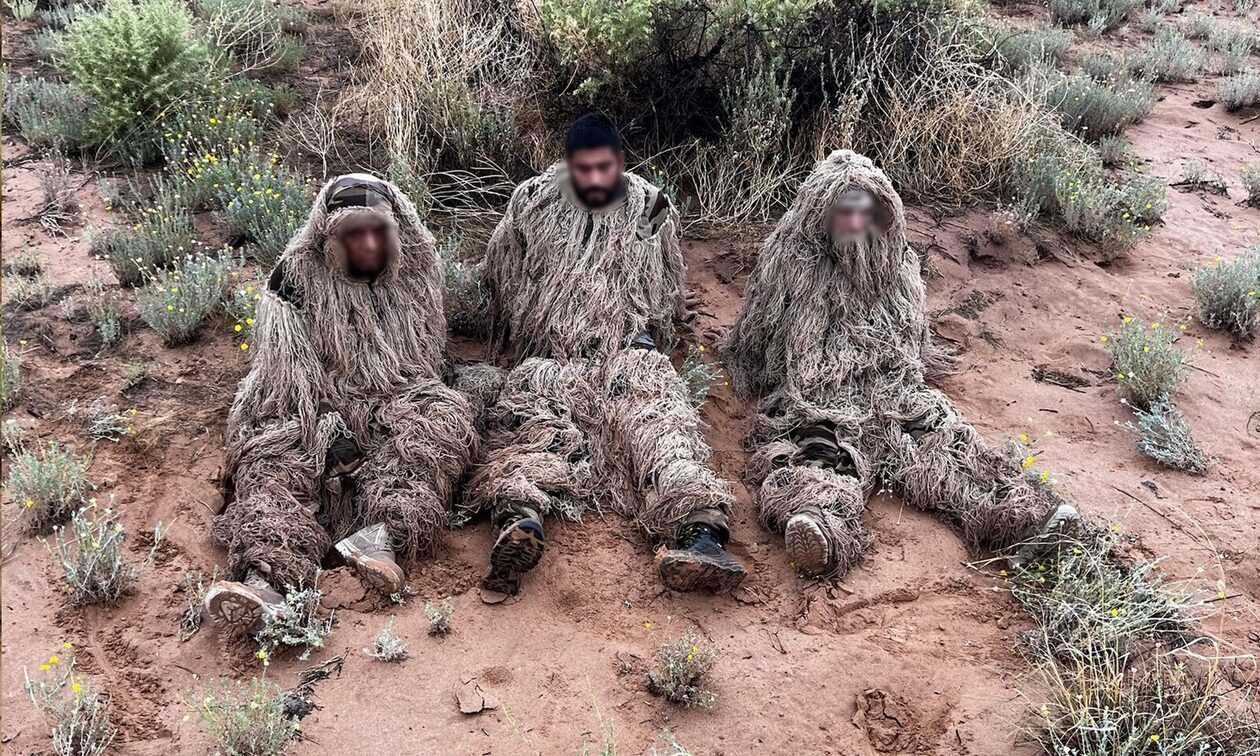 Οι φωτογραφίες που δημοσιεύτηκαν στους λογαριασμούς κοινωνικής δικτύωσης της Συνοριακής Περιπολίας δείχνουν τους τρεις άνδρες να φορούν τα λεγόμενα κοστούμια καμουφλάζ, τα οποία χρησιμοποιούνται συχνά από κυνηγούς.
