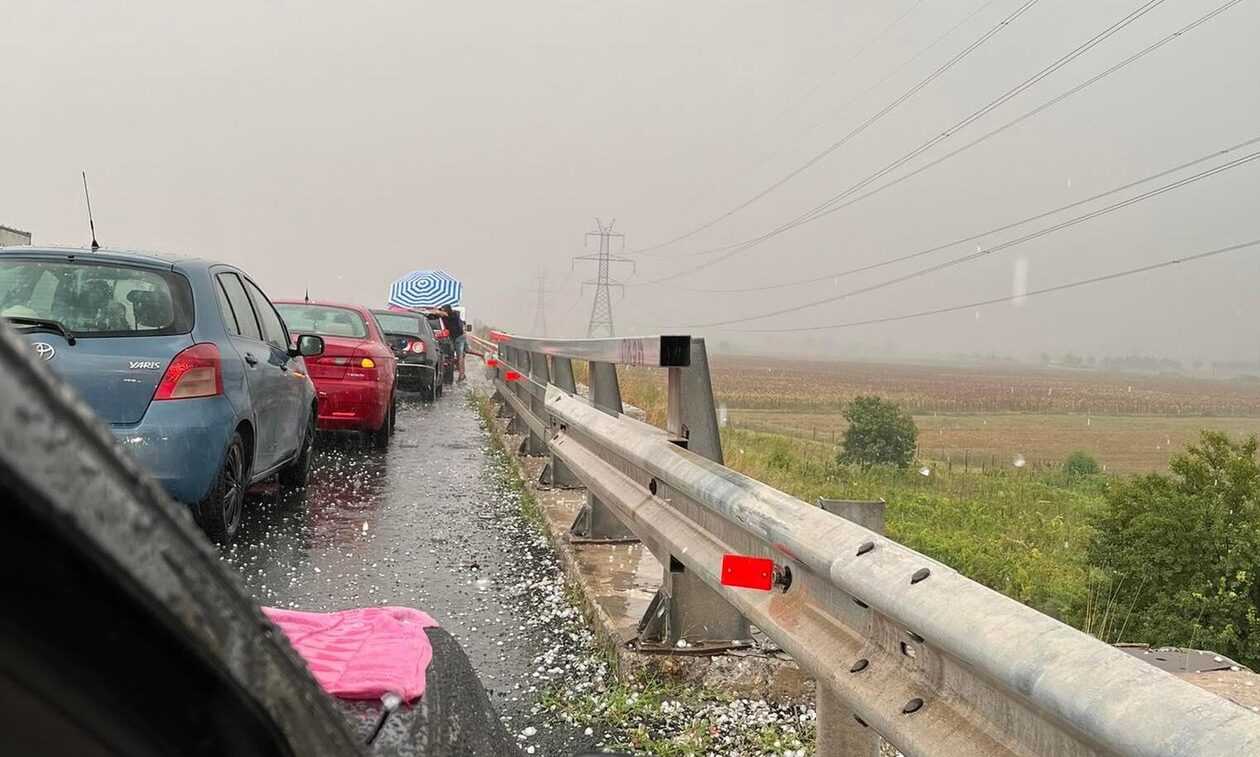 Σφοδρό χαλάζι και ουρές οχημάτων στα διόδια Πολυμύλου, της Εγνατίας Οδού, λίγο μετά τις 20:00 με τους οδηγούς και τους επιβάτες να αναμένουν για αρκετά λεπτά για να περάσουν.