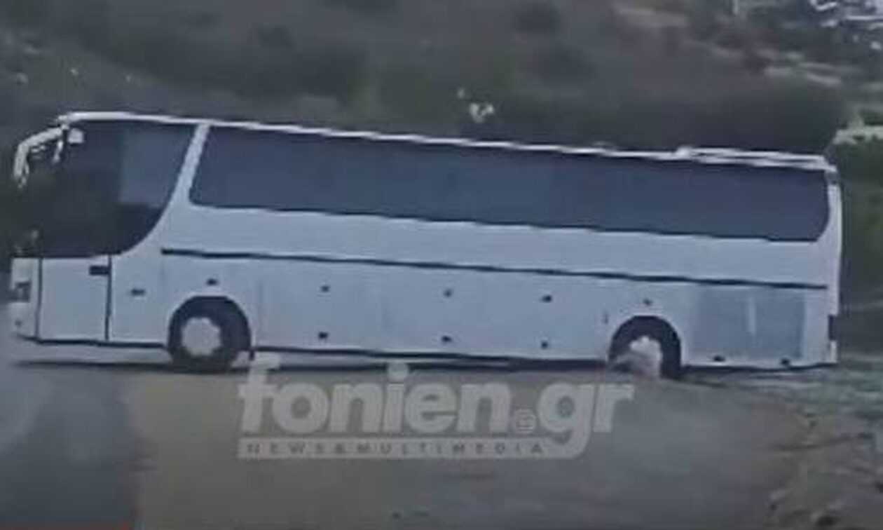 Όπως φαίνεται στο βίντεο του fonien.gr οι πίσω ρόδες του οχήματος βρίσκονται στον αέρα με τον οδηγό να προσπαθεί να το επαναφέρει στο οδόστρωμα.