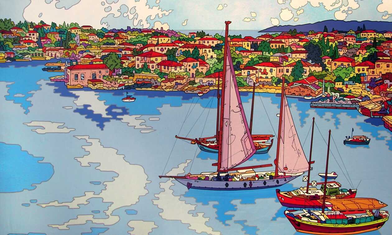 Πρόκειται για έργα γεμάτα χρώμα σε pop art διαθέσεις, που αποδίδουν το πνεύμα, την ατμόσφαιρα, τον αέρα των νησιών του Αργοσαρωνικού, της Αίγινας, της Ύδρας, αλλά και του Σουνίου και κυρίως των Σπετσών, όπου φιλοξενείται η έκθεση. Γωνιές χαρακτηριστικές, με τα λιμανάκια, τα σοκάκια, τις βαρκούλες, το περίφημο Ποσειδώνιο, σήμα κατατεθέν των Σπετσών, εμφανίζονται σε μια ενδιαφέρουσα, διαφορετική, κόμικς εκδοχή.