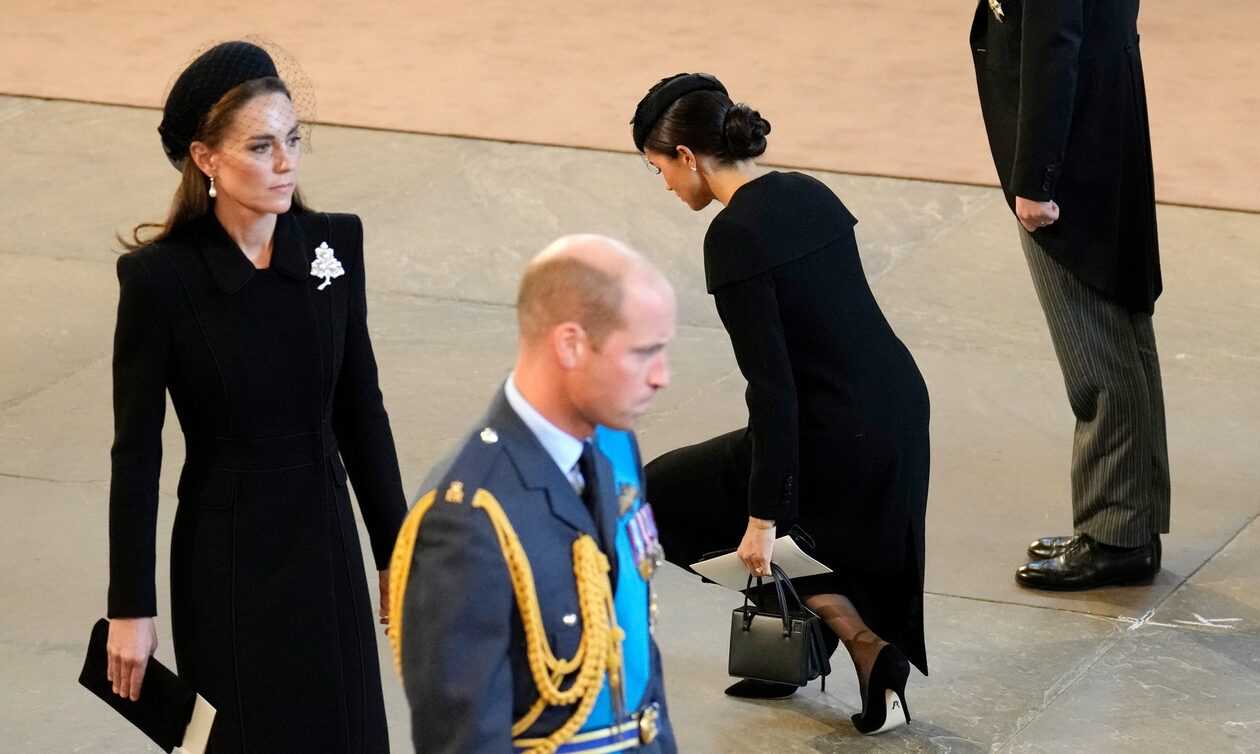 Ο πατέρας τους, ο βασιλιάς Κάρολος, βρισκόταν ακριβώς μπροστά τους, μαζί με τα υπόλοιπα παιδιά της Ελισάβετ. Η βασιλική σύζυγος Καμίλα, η σύζυγος του διαδόχου Ουίλιαμ, Κέιτ, η πριγκίπισσα της Ουαλίας και η σύζυγος του Χάρι, η δούκισσα του Σάσεξ Μέγκαν, θα μεταβούν στο Γουεστμίνστερ με αυτοκίνητο.