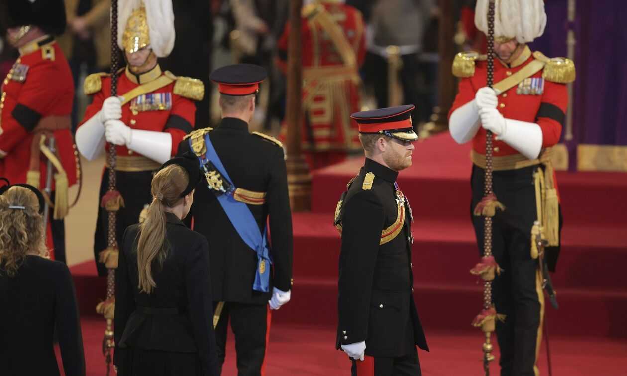 Οι δύο γιοί του βασιλιά Καρόλου Γ’ φορούσαν στρατιωτική στολή -ο Χάρι δεν φορούσε πλέον στολή μετά την ηχηρή απομάκρυνσή του από τη μοναρχία-, αντίθετα από τα έξι εξαδέλφια τους. Στάθηκαν για 15 λεπτά με την πλάτη προς το φέρετρο και χαμηλωμένο το κεφάλι, υπό τα βλέμματα των επισκεπτών που έφθαναν για να αποτίσουν ύστατο φόρο τιμής στη σορό της Ελισάβετ Β’, η οποία θα παραμείνει εκτεθειμένη σε λαϊκό προσκύνημα μέχρι το πρωί της Δευτέρας.