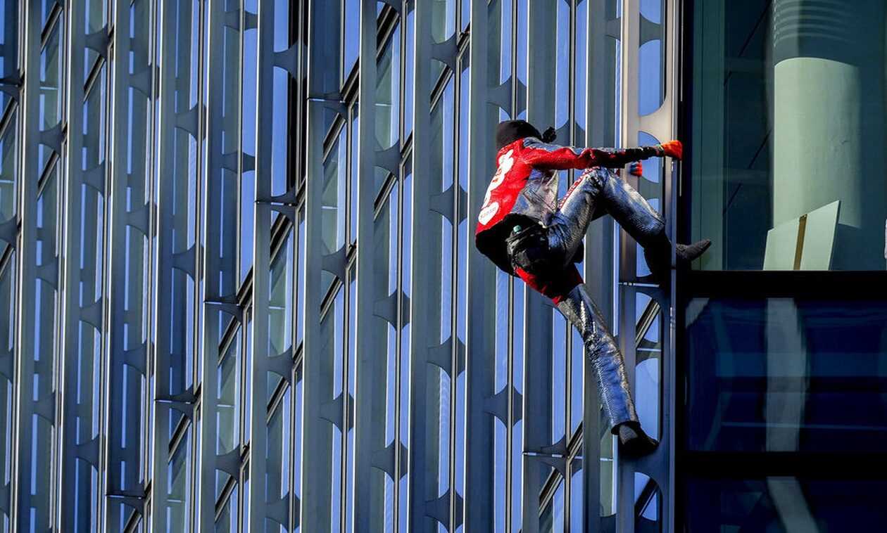 Ο Aλέν Ρομπέρ έχει σκαρφαλώσει σε πολλά από τα ψηλότερα κτήρια του κόσμου, συχνά χωρίς άδεια. Ντυμένος στα κόκκινα το Σάββατο σήκωσε τα χέρια του ψηλά καθώς έφτασε στην κορυφή του κτιρίου Tour Total ύψους 187 μέτρων, το οποίο δεσπόζει πάνω από την επιχειρηματική περιοχή La Defense της γαλλικής πρωτεύουσας.