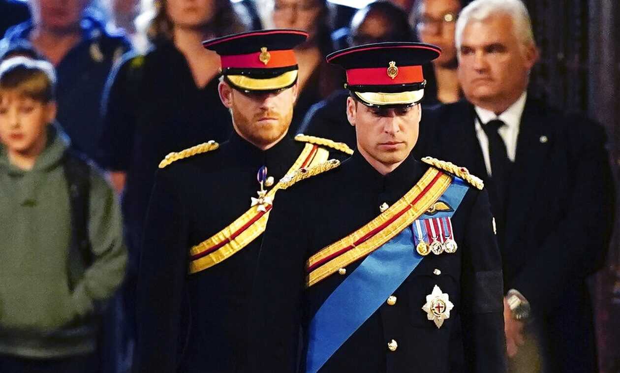 Οι πρίγκιπες Ουίλιαμ και Χάρι, ντυμένοι και οι δύο με στρατιωτική στολή, στέκονταν σε κάθε άκρο του φέρετρου της γιαγιάς τους. Ο Χάρι είχε αποτραπεί στο παρελθόν να φορέσει τη στρατιωτική στολή, αλλά τελικά του δόθηκε άδεια ειδικά για την αγρυπνία.