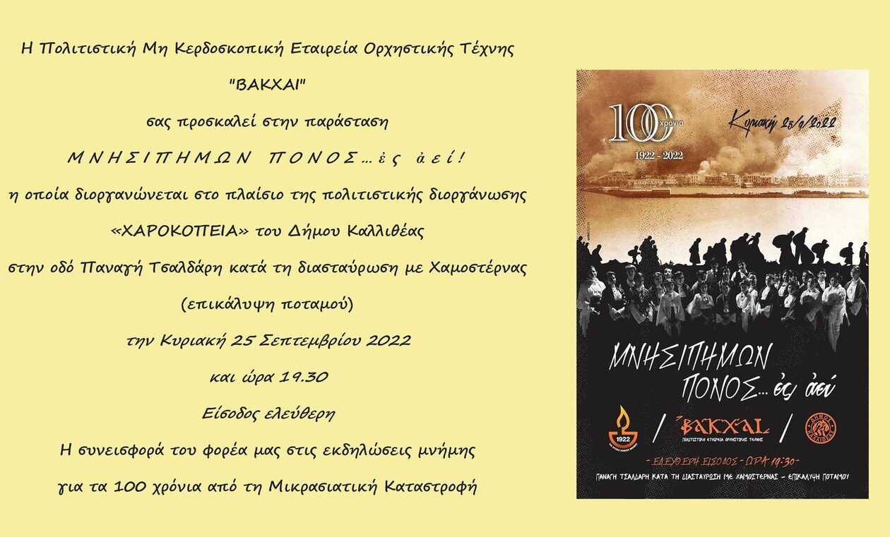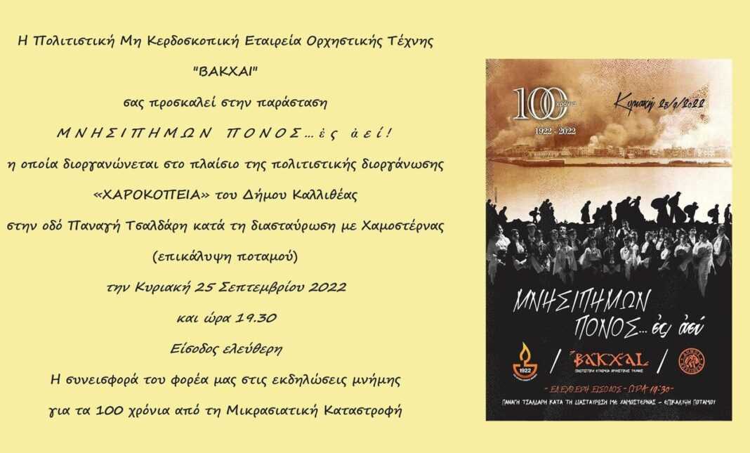 Στο πλαίσιο των εκδηλώσεων «Χαροκόπεια» του Δήμου Καλλιθέας, η Πολιτιστική Εταιρεία Ορχηστικής Τέχνης «ΒΑΚΧΑΙ» συμμετέχει στις εκδηλώσεις μνήμης για τα 100 χρόνια από τη Μικρασιατική Καταστροφή και διοργανώνει την Κυριακή (25/09) στις 19.30μμ [στη συμβολή των οδών Παναγή Τσαλδάρη στη συμβολή της με τη Χαμοστέρνας] την μουσικοχορευτική εκδήλωση «Μνησιπήμων Πόνος.. ες αεί!»