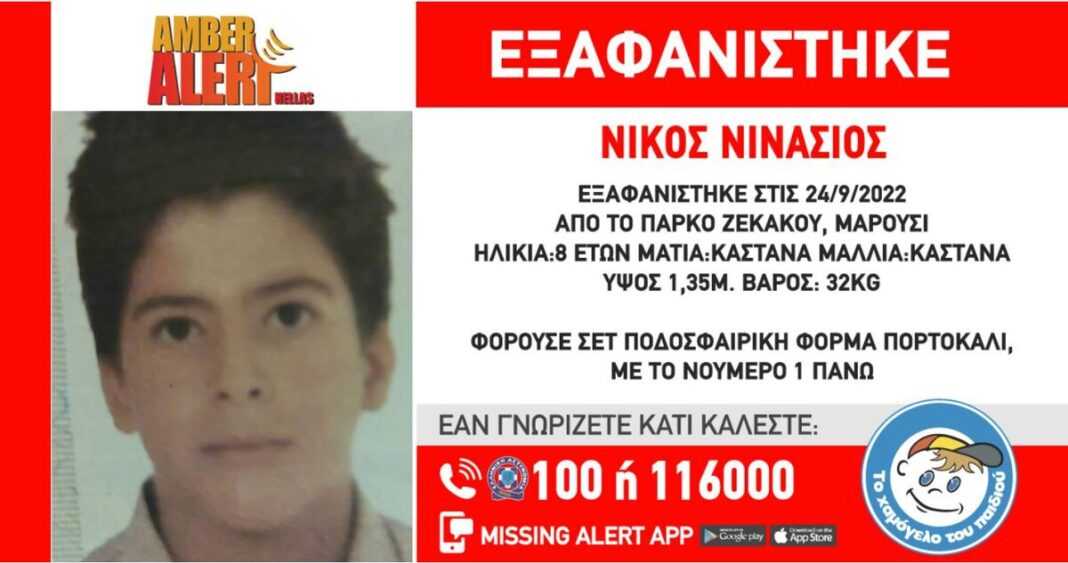 Όπως αναφέρει η ανακοίνωση από το Χαμόγελο του Παιδιού, στις 24/09/2022, και ώρα 21:20, εξαφανίστηκε από το πάρκο Ζεκάκου στο Μαρούσι, ο Νινάσιος Νικόλαος, 8 ετών. Το «Χαμόγελο του Παιδιού» ενημερώθηκε για την εξαφάνιση του ανήλικου Νινάσιου Νικόλαου, στις 24/09/2022 και ώρα 22:50 προχώρησε στην ενεργοποίηση του μηχανισμού AMBER ALERT HELLAS.