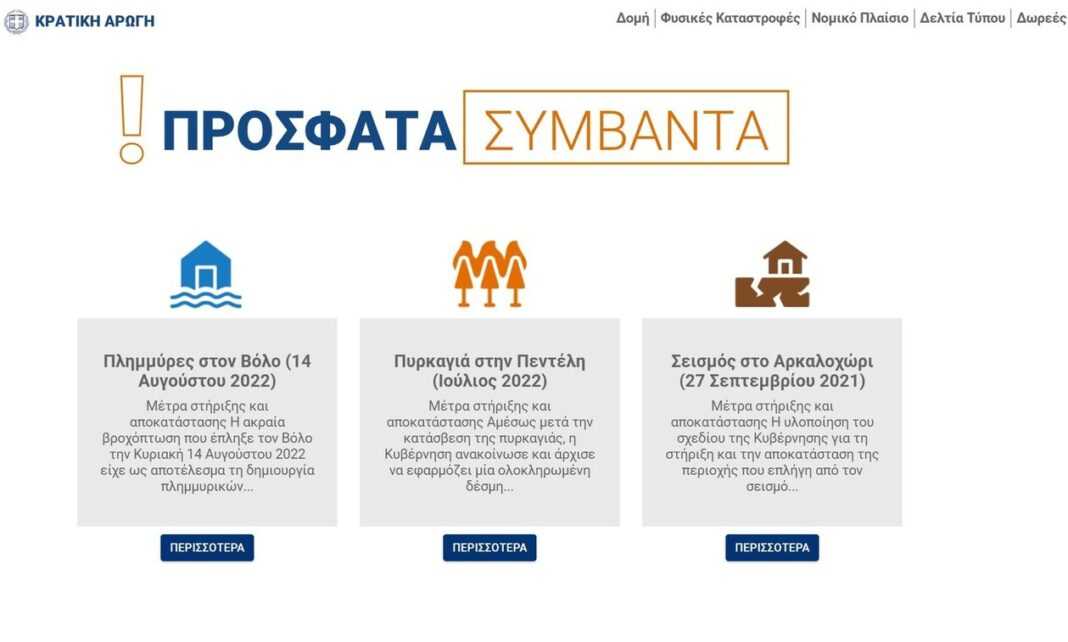 Σε λειτουργία τέθηκε ο ανανεωμένος ιστότοπος της κρατικής αρωγής (arogi.gov.gr), στον οποίο είναι συγκεντρωμένο το σύνολο των μέτρων στήριξης που προωθεί η Κυβέρνηση στις περιοχές που έχουν πληγεί από φυσικές καταστροφές. Μέσω του site, οι πληγέντες από φυσικές καταστροφές μπορούν να υποβάλουν αίτηση για χορήγηση πρώτης αρωγής, όπου προβλέπεται.