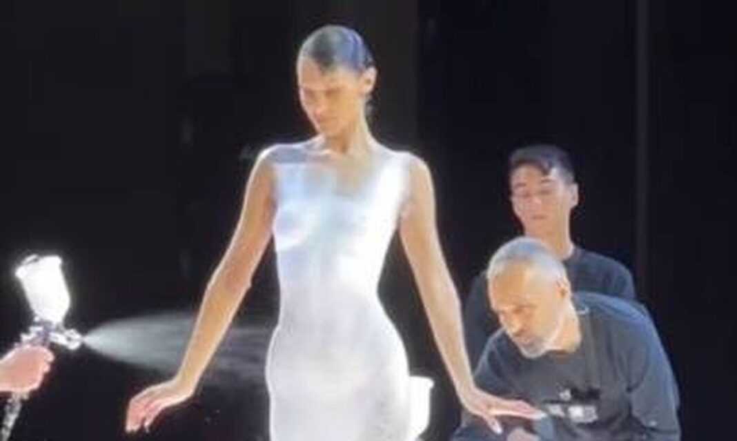 H Μπέλα Χαντίντ εμφανίστηκε γυμνή στην πασαρέλα και μια ομάδα την ψέκασε με υγρό που μετατρέπεται σε ύφασμα, για τις ανάγκες ενός εντυπωσιακού σόου του οίκου μόδας Coperni