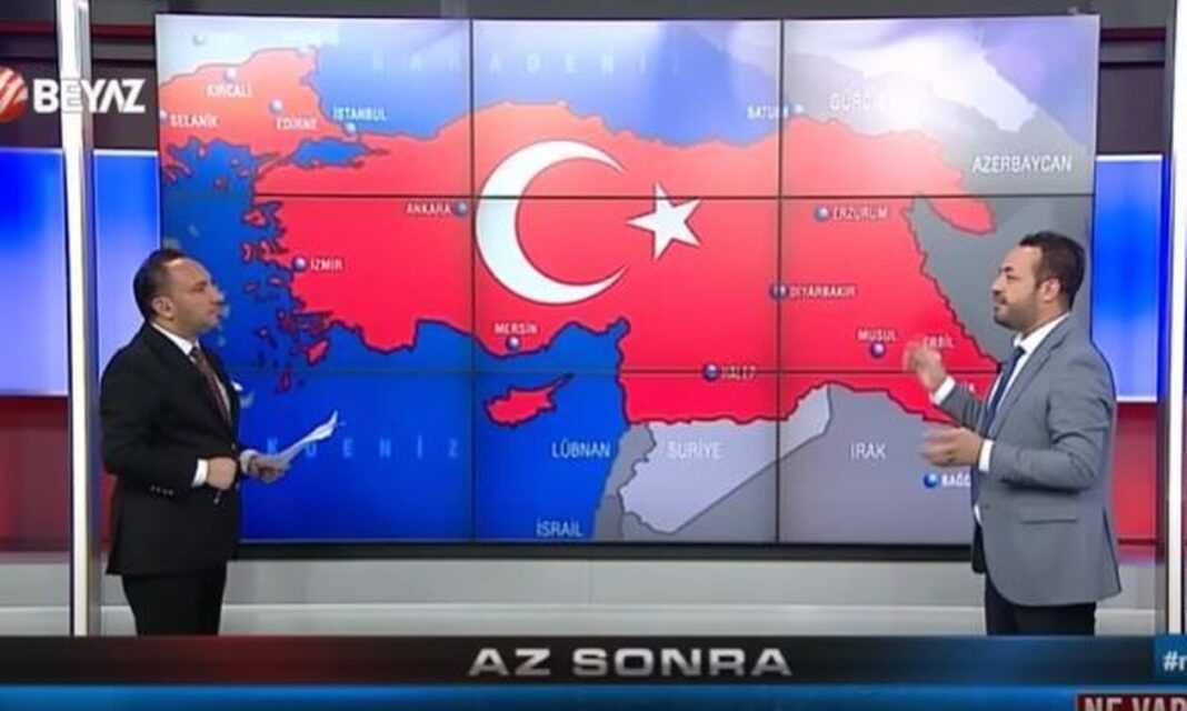 «Τι σύνορα θα έχει η Τουρκία το 2025 και πως προβλέπεται αυτό;», ρωτάει κάποια στιγμή ο παρουσιαστής, με τον αναλυτή ν’ απαντάει: «Αυτός ο χάρτης διέρρευσε. Ορίστε κύριε!».