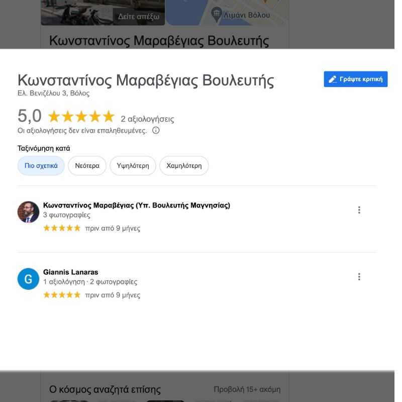 Μάλιστα, εκτός της άριστης κριτικής που έκανε ο ίδιος για τον εαυτό του, διατηρεί και επιχειρηματικό προφίλ στη Google, λες και η Βουλευτική ιδιότητα είναι επιχείρηση!