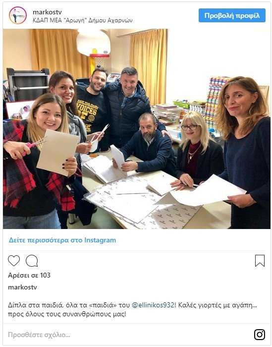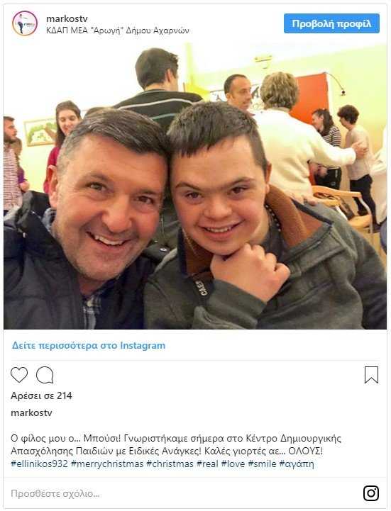 «Ο φίλος μου ο… Μπούσι! Γνωριστήκαμε σήμερα στο Κέντρο Δημιουργικής Απασχόλησης Παιδιών με Ειδικές Ανάγκες! Καλές γιορτές σε… όλους», έγραψε ο δημοσιογράφος στον προσωπικό του λογαριασμό στο instagram.