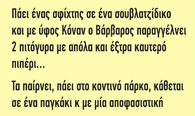 Πάει ένας σφίχτης σε ένα σουβλατζίδικο και με ύφος Κόναν ο Βάρβαρος παραγγέλνει…