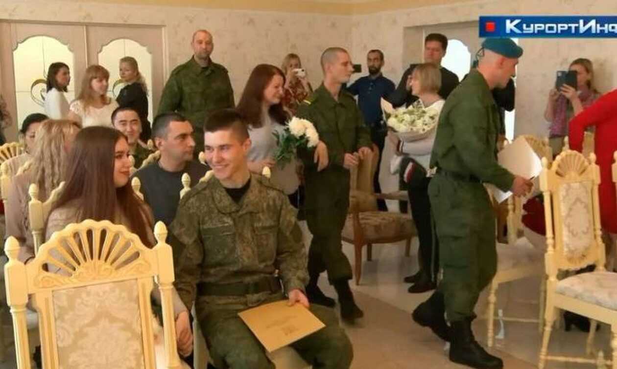 Η Ρωσία διοργανώνει γρήγορους μαζικούς γάμους επειδή οι άνδρες φεύγουν για να πολεμήσουν στην Ουκρανία. Βίντεο δείχνουν δεκάδες ζευγάρια να ανταλλάσσουν όρκους, δαχτυλίδια και φιλιά την περασμένη εβδομάδα.