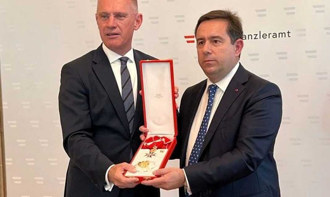 Με προεδρικό διάταγμα ο Ομοσπονδιακός Υπουργός Εσωτερικών της Αυστρίας, Gerhard Karner, παρουσία του Ομοσπονδιακού Καγκελάριου, Karl Nehammer, απένειμε σήμερα στη Βιέννη τον Μεγαλόσταυρο του Τάγματος της Δημοκρατίας της Αυστρίας.