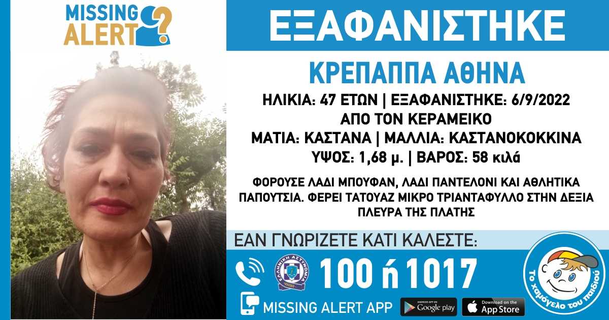 Πρόκειται για την Κρέπαππα Αθηνά, 47 ετών, με το «Χαμόγελο του Παιδιού» να προχωρά στη δημοσιοποίηση των στοιχείων της, κατόπιν αιτήματος της οικογένειάς της, καθώς ενδέχεται να συντρέχουν λόγοι οι οποίοι θέτουν τη ζωή της σε κίνδυνο.