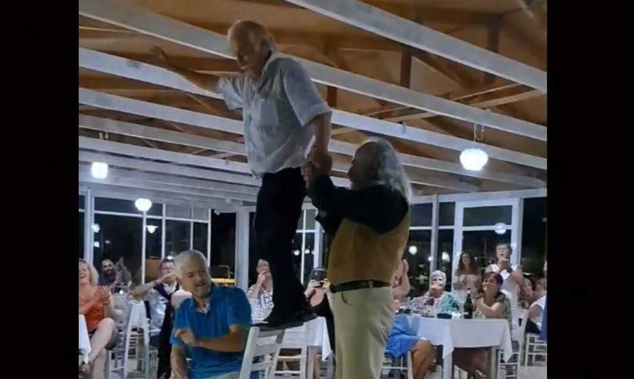 Θαμώνες κρητικής ταβέρνας δεν πίστευαν στα μάτια τους βλέποντας έναν ηλικιωμένο πελάτη του μαγαζιού να ανεβαίνει πάνω σε καρέκλες και να χορεύει με την «ψυχή» του!