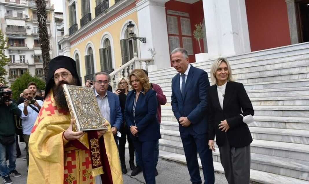 Τη συνεορτάζουσα Ιερή Εικόνα της Παναγίας Γερόντισσας, του Πολιούχου Αγίου Δημητρίου και τη Λάρνακα του Αγίου με τα Ιερά Λείψανα, υποδέχθηκε, στον αύλειο χώρο του Διοικητηρίου, ο υφυπουργός Εσωτερικών, αρμόδιος για θέματα Μακεδονίας και Θράκης, Σταύρος Καλαφάτης.