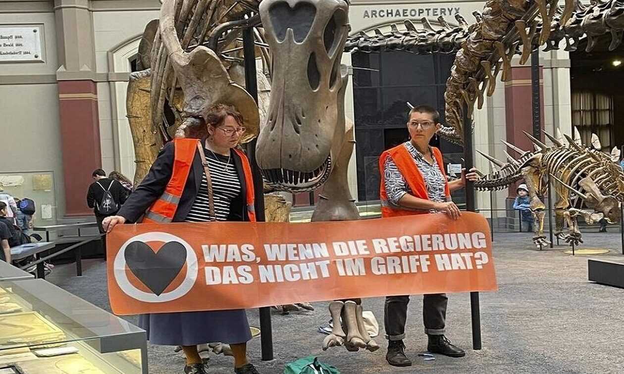 Σε μια ακόμη διαμαρτυρία ακτιβιστών για το κλίμα, δύο γυναίκες χρησιμοποίησαν κόλλα για να κολλήσουν σε κιγκλιδώματα σε μια έκθεση δεινοσαύρων στο Μουσείο Φυσικής Ιστορίας του Βερολίνου, καλώντας τη γερμανική κυβέρνηση να εντείνει τα μέτρα για την καταπολέμηση της κλιματικής αλλαγής.