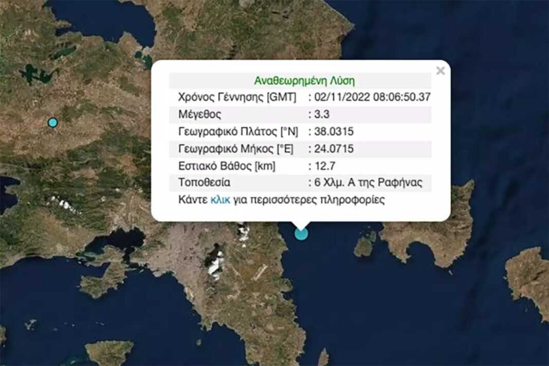 Σεισμική δόνηση μεγέθους 3,3 ρίχτερ σημειώθηκε λίγο μετά τις 10 το πρωί της Τετάρτης (2/11) στην Ραφήνα. Ο σεισμός έγινε αισθητός και σε άλλες περιοχές της Αττικής. Σύμφωνα με την αυτόματη λύση του Γεωδυναμικού Ινστιτούτου είχε εστιακό βάθος 12,7 χιλιόμετρα και το επίκεντρο ήταν 6 χιλιόμετρα ανατολικά της Ραφήνας. Ψυχραιμία και όχι πανικό συνιστούν οι ειδικοί σχετικά με τα μέτρα που πρέπει να λάβουν οι πολίτες σε περίπτωση σεισμού.