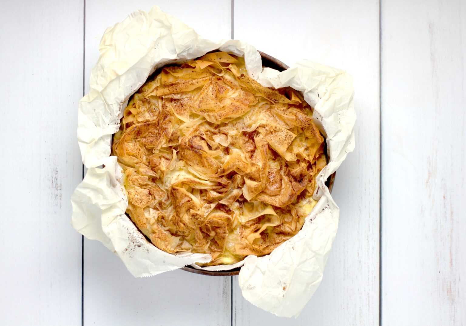 - Βουτυρώνετε ελαφρά ένα ταψί 12 ιντσών στρογγυλό Χ 2 ιντσών βαθύ. Στρώνουμε το φύλλο, ένα φύλλο τη φορά, αλείφοντας το καθένα με λιωμένο βούτυρο.