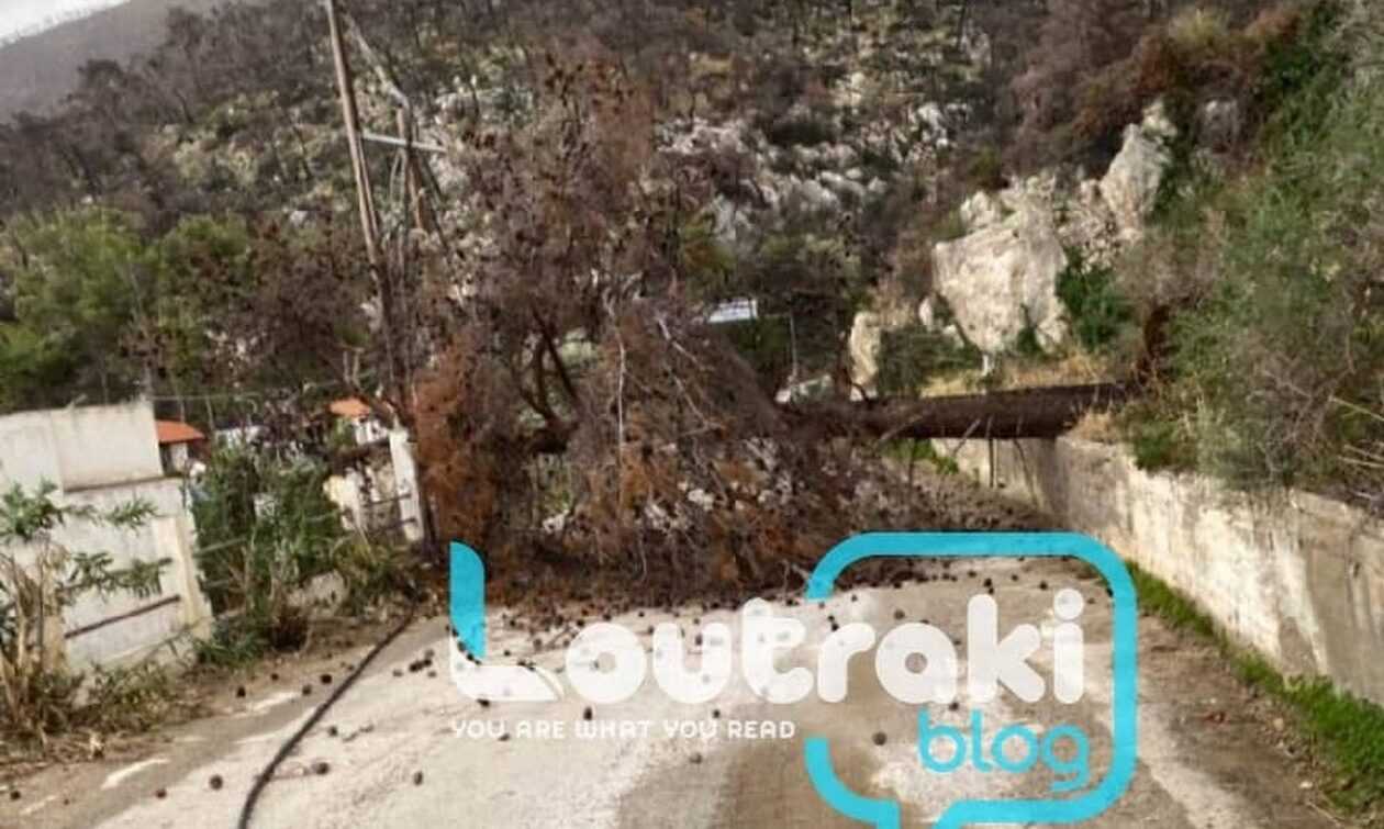 Συγκεκριμένα σύμφωνα με το loutrakiblog.gr το δέντρο έπεσε καταμεσής του δρόμου, την ώρα που διερχόταν ένα αυτοκίνητο με αποτέλεσμα να εγκλωβιστεί. Ο οδηγός και ο συνοδηγός γλίτωσαν τελευταία στιγμή.
