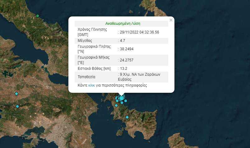 Στις 06:32 σημειώθηκε σεισμική δόνηση μεγέθους 4,7 βαθμών της κλίμακας Ρίχτερ, στην ίδια περιοχή, με εστιακό βάθος τα 13,2 χλμ., και επίκεντρο τα 9 χλμ. νοτιοανατολικά των Ζαράκων Ευβοίας σύμφωνα με την αναθεωρημένη λύση του Γεωδυναμικού Ινστιτούτου του Αστεροσκοπείου Αθηνών.