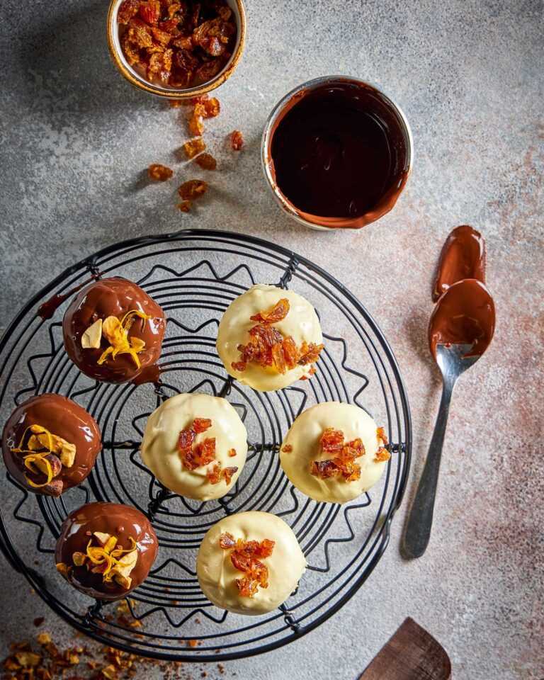 - Τους αραδιάζουμε σε λαδόκολλα και, πριν η σοκολάτα κρυώσει και στερεοποιηθεί, τους πασπαλίζουμε με κοπανισμένο αμύγδαλο και ξύσμα πορτοκαλιού.
