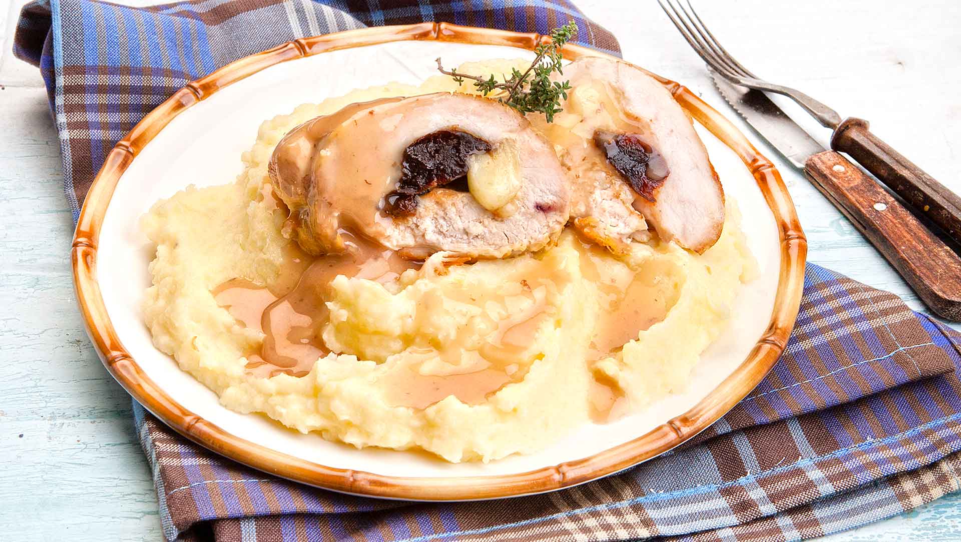 • Έπειτα, κόβουμε κάθε φιλέτο σε δύο διαγώνια κομμάτια. Τα στήνουμε στο πιάτο πάνω σε πλούσιο πουρέ πατάτας.