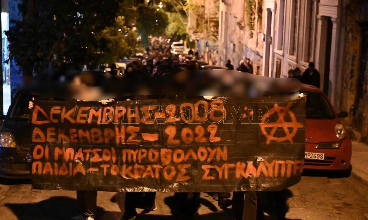 Οι διαδηλωτές πραγματοποιούν πορεία στους δρόμους των Εξαρχείων, υπό την παρουσία ισχυρής αστυνομικής δύναμης.