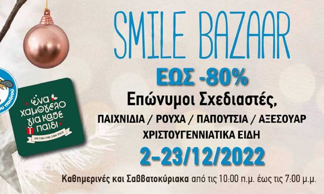 Με μεγάλη χαρά και φέτος «Το Χαμόγελο του Παιδιού» προσκαλεί μικρούς και μεγάλους στο Χριστουγεννιάτικο Smile Bazaar, το οποίο πραγματοποιείται από 2 έως 23 Δεκεμβρίου 2022, με δωρεάν είσοδο στους χώρους του Οργανισμού «Το Χαμόγελο του Παιδιού», Γαρυττού 80, Αγία Παρασκευή, 5ος όροφος (πλησίον μετρό Αγ. Παρασκευής).