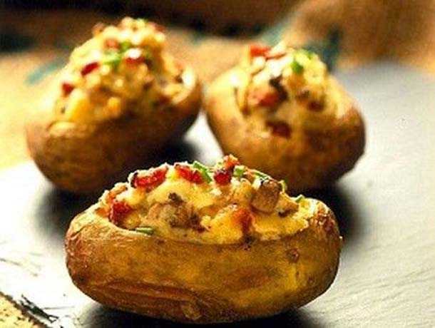 Βράζουμε τις πατάτες με τη φλούδα (καλά πλυμένη) σε αλατισμένο νερό για 15΄. Θέλουμε να «κρατούν» στο πιρούνι. Τις αδειάζουμε σαν βάρκα και τις τοποθετούμε σε φωλιές από αλουμινόχαρτο. Τη σάρκα την πολτοποιούμε με το μπέικον, προσθέτουμε το λάδι και τα μπαχάρια. Ανακατεύουμε με τα υπόλοιπα υλικά, αλλά κρατάμε λίγο, ελάχιστο, τυρί για από πάνω. Γεμίζουμε τις πατάτες και πασπαλίζουμε με το τυρί. Ψήνουμε σε μέτριο προς δυνατό φούρνο για περίπου 20΄. Λίγο σκόρδο στο μείγμα εντείνει τη γεύση.