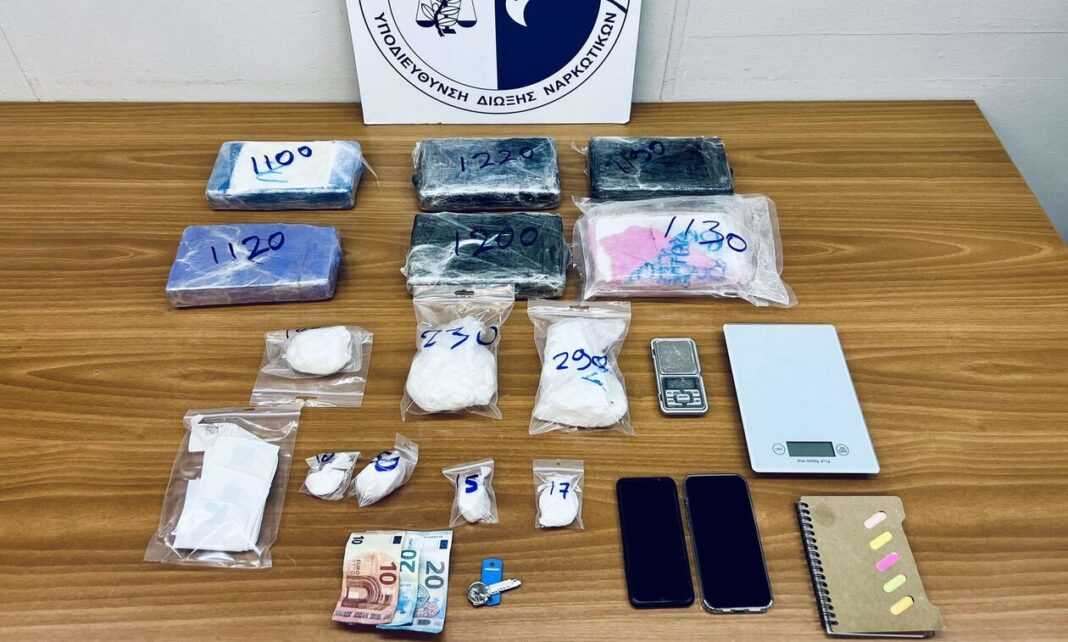 Επτά κιλά και 672 γραμμ. κοκαΐνης, 50 ευρώ, δύο ηλεκτρονικές ζυγαριές ακριβείας, δύο κινητά τηλέφωνα και υλικά για τη συσκευασία των ναρκωτικών (νάιλον και χάρτινες συσκευασίες και ρολό περιτυλίγματος).