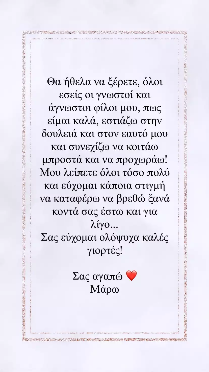 Στη συνέχεια έγραψε: «Θα ήθελα να ξέρετε όλοι, εσείς οι γνωστοί και οι άγνωστοι φίλοι μου, πως είμαι καλά εστιάζω στη δουλειά και τον εαυτό μου και συνεχίζω να κοιτάω μπροστά και να προχωράω. Μου λείπετε όλοι τόσο και εύχομαι κάποια στιγμή να καταφέρω να βρεθώ ξανά κοντά σας έστω και για λίγο. Σας εύχομαι ολόψυχα καλές γιορτές. Σας αγαπώ. Μάρω».