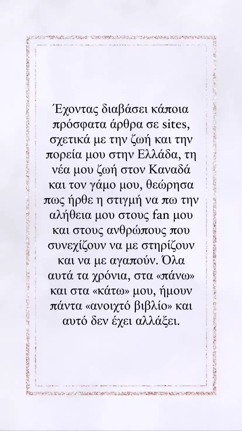 «Έχοντας διαβάσει κάποια πρόσφατα άρθρα σε sites, σχετικά με την ζωή και την πορεία μου στην Ελλάδα, τη νέα μου ζωή στον Καναδά και τον γάμο μου, θεώρησα πως ήρθε η στιγμή να πω την αλήθεια μου στους fans μου και στους ανθρώπους που συνεχίζουν να με στηρίζουν και να με αγαπούν. Όλα αυτά τα χρόνια στα πάνω μου και στα κάτω μου, ήμουν πάντα ανοιχτό βιβλίο και αυτό δεν έχει αλλάξει.