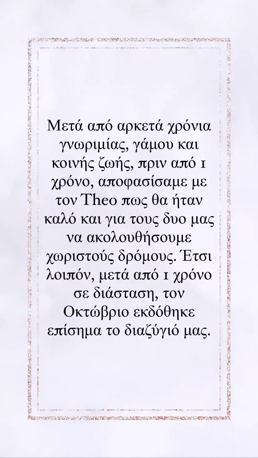 Μετά από αρκετά χρόνια γνωριμίας, γάμου και κοινής ζωής, πριν από έναν χρόνο αποφασίσαμε με τον Theo πως θα ήταν καλό και για τους δυο μας να ακολουθήσουμε χωριστούς δρόμους. Έτσι λοιπόν μετά από έναν χρόνο σε διάσταση τον Οκτώβριο εκδόθηκε επίσημα το διαζύγιό μας».