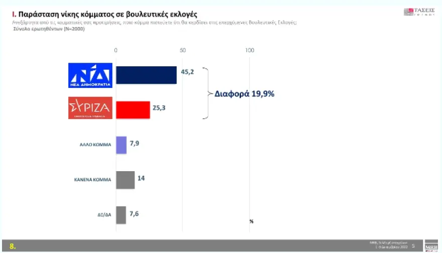 Στην παράσταση νίκης, προηγείται με 45,2 % η ΝΔ, ενώ ο ΣΥΡΙΖΑ συγκεντρώνει ποσοστό 25.3 %. Η επιλογή «Κανένα κόμμα» καταγράφει ποσοστό 14 %. Ακολουθούν «Άλλο κόμμα» με ποσοστό 7,9 % και «Δεν ξέρω/Δεν απαντώ» με ποσοστό 7.6 %.