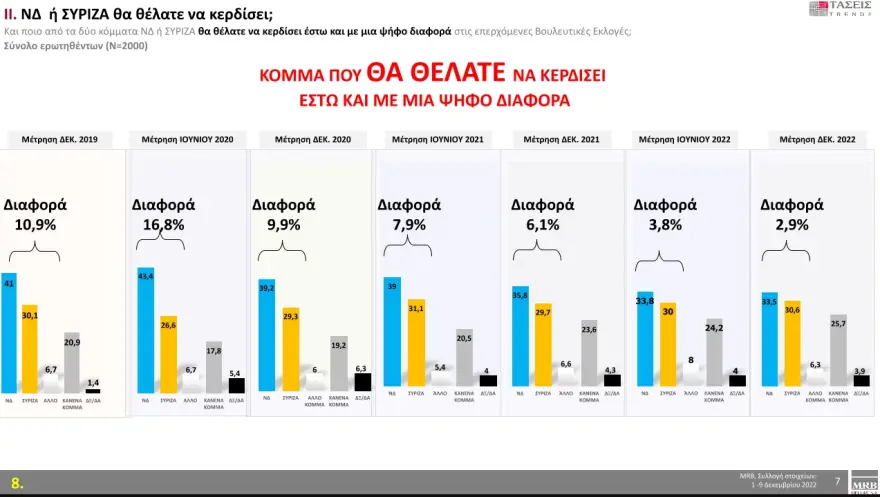 Στο ερώτημα ποιο από τα δύο κόμματα, ΝΔ ή ΣΥΡΙΖΑ, θα θέλατε να κερδίσει έστω και με μία ψήφο διαφορά στις επερχόμενες βουλευτικές εκλογές, το 33,5 % απαντά η ΝΔ, το 30,6 % ο ΣΥΡΙΖΑ, ενώ το 25,7 % κανένα κόμμα.