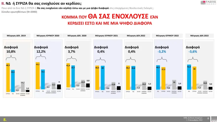 Στο ερώτημα ποιο από τα δύο κόμματα, ΝΔ ή ΣΥΡΙΖΑ, θα σας ενοχλούσε αν κερδίσει έστω και με μία ψήφο διαφορά στις επερχόμενες βουλευτικές εκλογές, το 41,6 % απαντά ΝΔ και το 38 % απαντά ΣΥΡΙΖΑ.