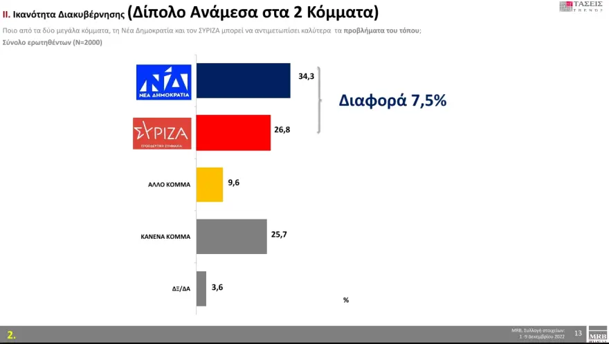 Συγκεκριμένα, ο πρωθυπουργός και πρόεδρος της ΝΔ συγκεντρώνει το 39,3 % των ερωτηθέντων και ο πρόεδρος του ΣΥΡΙΖΑ και επικεφαλής της αξιωματικής αντιπολίτευσης το 31,3 %. «Κανένας από τους δύο» απαντά το 23,6 %.