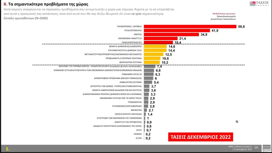 Οι πολίτες θεωρούν ότι τα 3 σημαντικότερα προβλήματα της χώρας είναι: Πληθωρισμός/Ακρίβεια με 58,6 %, Υγεία/Περίθαλψη με 41,9 %, Ανεργία με 34,9 %.