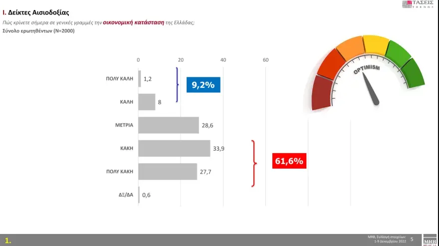 Σε ό,τι αφορά τους δείκτες αισιοδοξίας και συγκεκριμένα στο ερώτημα «πώς πιστεύετε ότι πάνε τα πράγματα γενικά στη χώρα μας», το 61,2 % απαντά «Πολύ άσχημα-Αρκετά άσχημα», ενώ το 11% απαντά «Πολύ καλά-Αρκετά καλά».