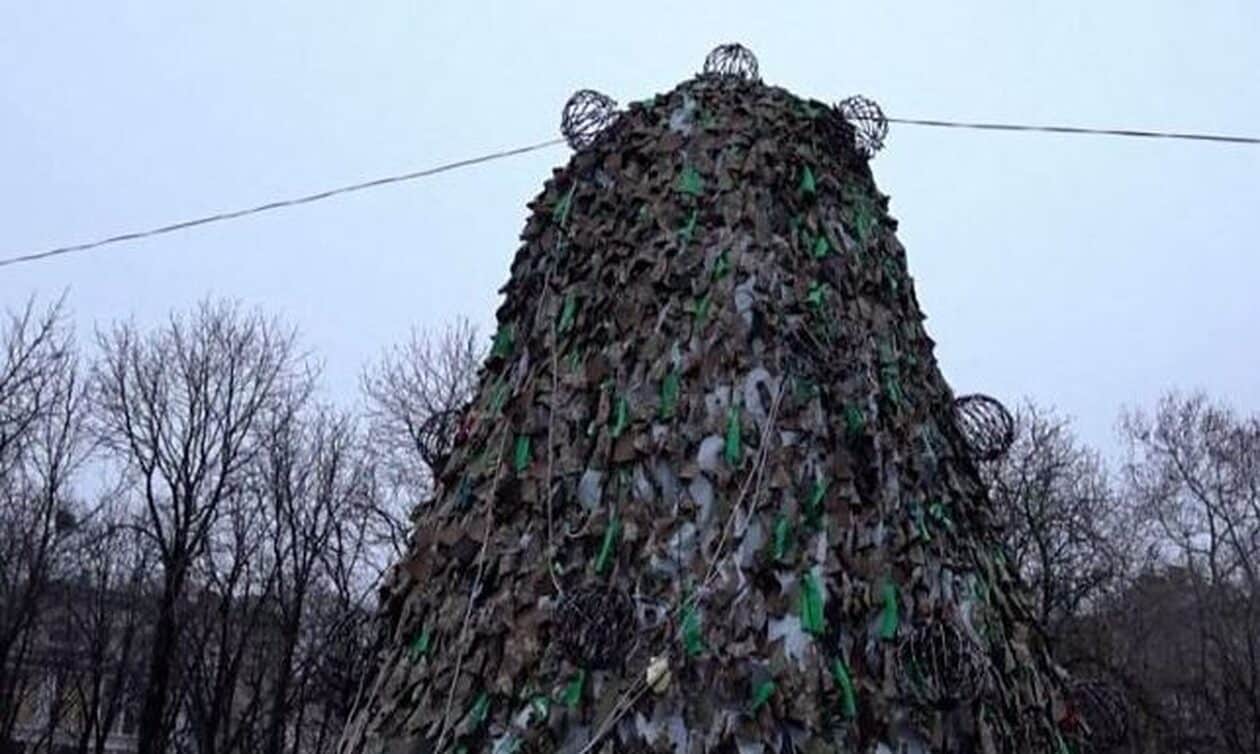 Ένα διαφορετικό χριστουγεννιάτικο δέντρο έφτιαξαν εθελοντές στην πόλη Μικολάιβ στη νότια Ουκρανία, αντλώντας «έμπνευση» από τη θλιβερή πραγματικότητα του πολέμου που συνεχίζεται εδώ και περίπου 10 μήνες.