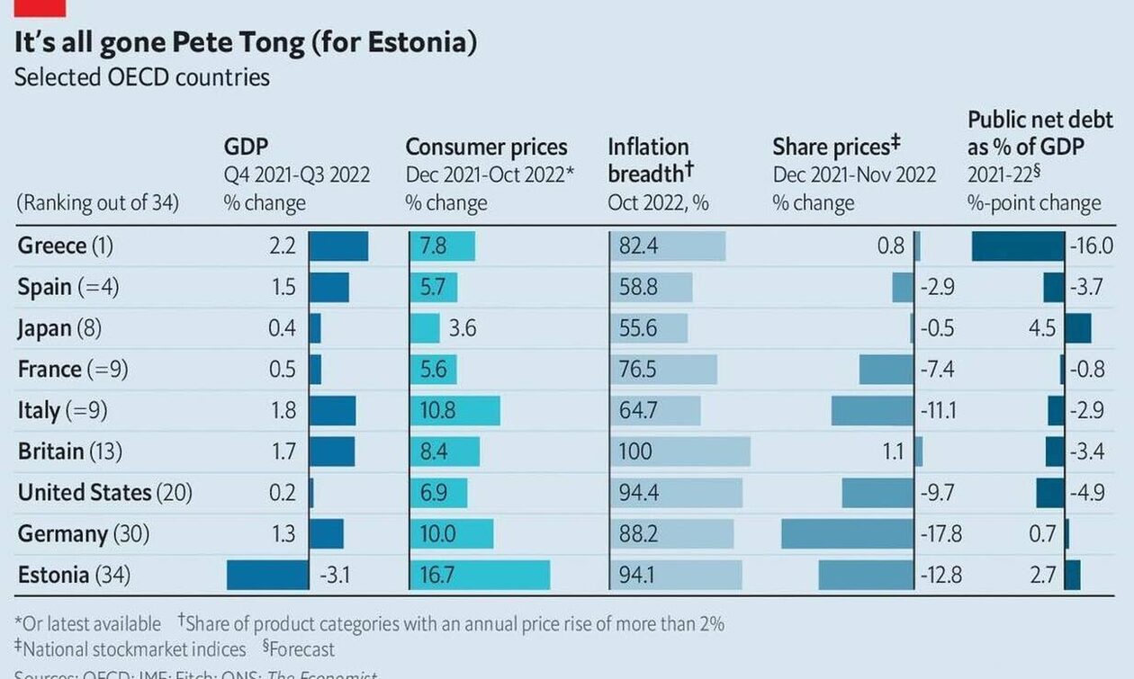 Από οικονομική άποψη, η χρονιά που πέρασε ήταν κακή σχεδόν για όλους. Ο πληθωρισμός 10% από έτος σε έτος σε όλο τον πλούσιο κόσμο έχει περικόψει τα εισοδήματα των νοικοκυριών. Οι επενδυτές έχουν χάσει καθώς τα παγκόσμια χρηματιστήρια έχουν υποχωρήσει κατά 15%. Ωστόσο, αυτή η κακή συνολική απόδοση κρύβει μεγάλες διαφορές: ορισμένες χώρες τα έχουν πάει αρκετά καλά. (ΑΑΔΕ: Ποιες φορολογικές υποθέσεις παραγράφονται σε 12 ημέρες).