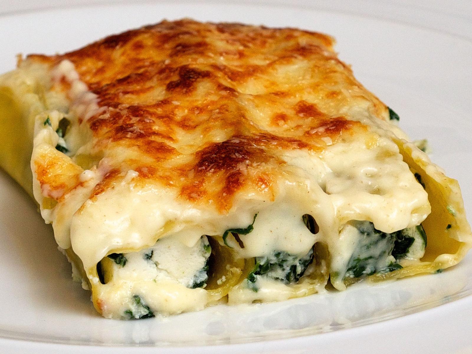 Βήμα 5: Ψήνουμε τις κρέπες: Σ’ ένα πυρίμαχο σκεύος απλώνουμε μια λεπτή στρώση μπεσαμέλ. Τοποθετούμε από πάνω τις κρέπες τη μία δίπλα στην άλλη με το άνοιγμα προς τα κάτω και τις περιχύνουμε με την υπόλοιπη μπεσαμέλ. Πασπαλίζουμε την επιφάνεια με το λαδοτύρι και τις ψήνουμε στο φούρνο στους 200°C για 30 λεπτά, μέχρι να λιώσουν και να ροδίσουν τα τυριά. Σερβίρουμε τα κανελόνια ζεστά.