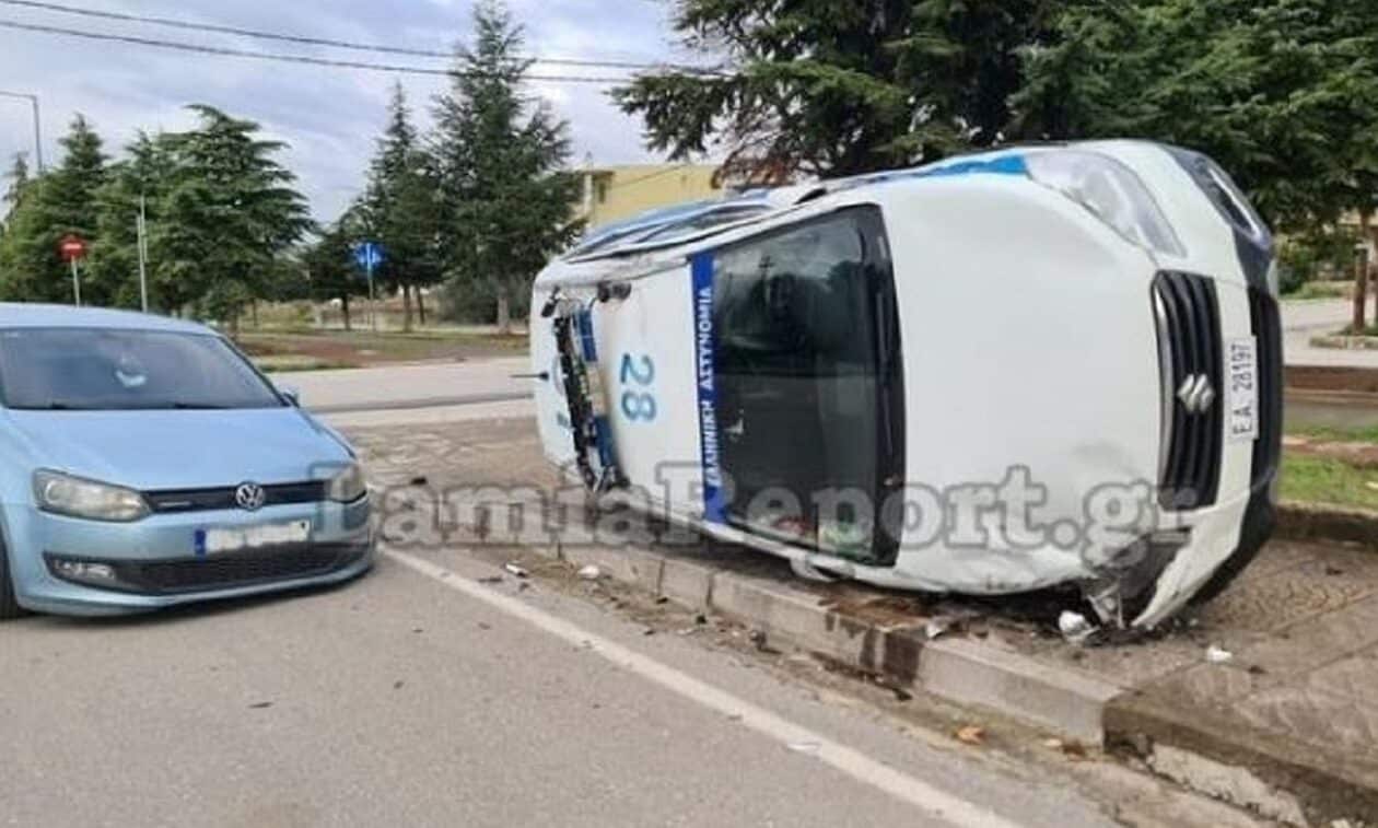 Μετά τη σύγκρουση, το περιπολικό εκτινάχθηκε και κατέληξε τουμπαρισμένο πάνω στο πεζοδρόμιο, ενώ από τη σύγκρουση των δύο οχημάτων σημειώθηκαν μόνο υλικές ζημιές.