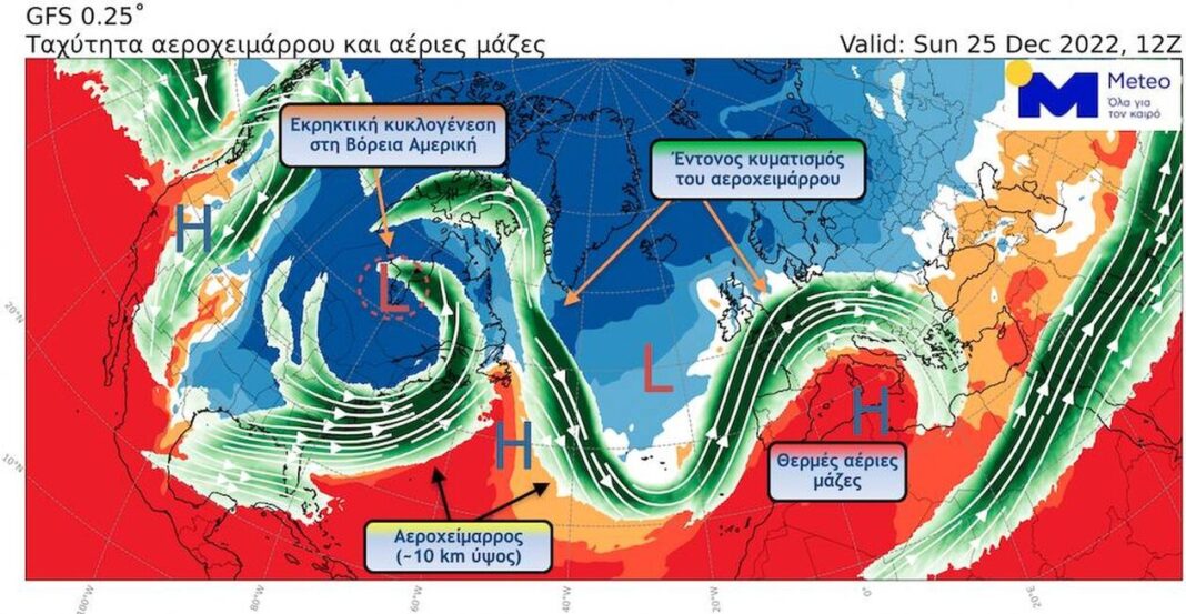 Σύμφωνα με νεότερα δεδομένα, ένα σημαντικό και μεγάλης κλίμακας μετεωρολογικό φαινόμενο βρίσκεται σε εξέλιξη στην περιοχή της Βόρειας Αμερικής την Πέμπτη 22 Δεκεμβρίου 2022 το οποίο αναμένεται να έχει σημαντικές επιπτώσεις στον καιρό της Ευρώπης κατά τη διάρκεια των Χριστουγέννων, όπως εξηγεί το meteo.gr.