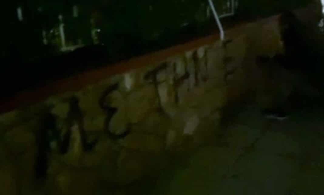 Μέλη της συλλογικότητας έβαψαν με μπογιές το εξωτερικό του σπιτιού κι έγραψαν με σπρέι συνθήματα.