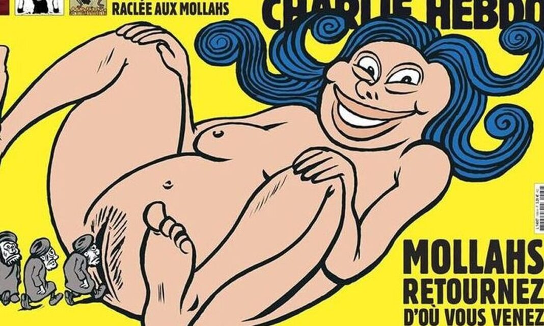 Στο στόχαστρο αυτή τη φορά το συντηρητικό, θεοκρατικό καθεστώς της Τεχεράνης που έχει ξεκινήσει αιματηρή καταστολή κατά των διαδηλωτών που εδώ και μήνες απαιτούν ελευθερίες. To πρωτοσέλιδο του Charlie Hebdo παρουσιάζει το σκίτσο μίας γυμνής γυναίκας με ανοικτά τα πόδια και τους μουλάδες να κάνουν ουρά για να μπουν στο σώμα της. Τίτλος του «Μουλάδες, επιστρέψτε από εκεί που βγήκατε».