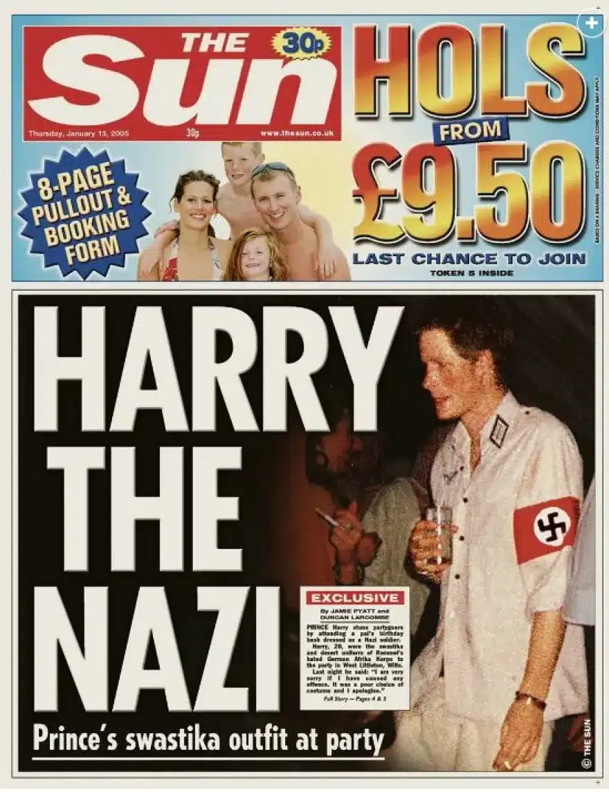 Ο Χάρι ήταν μόλις 20 χρονών όταν η βρετανική εφημερίδα Sun δημοσίευσε στο πρωτοσέλιδο της μια φωτογραφία που τον έδειχνε να διασκεδάζει ντυμένος Ναζί και φορώντας ένα περιβραχιόνιο με μια μεγάλη σβάστικα στο χέρι. Η φωτογραφία είχε τραβηχτεί στο πάρτι με θέμα «Αυτόχθονες και Αποικιοκράτες», στο οποίο είχε παρευρεθεί και ο Ουίλιαμ, φορώντας μια αυτοσχέδια εφαρμοστή στολή που παρέπεμπε σε τομάρι άγριου ζώου.